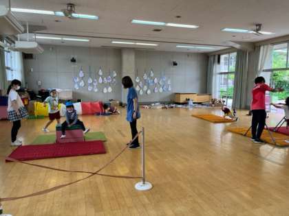 リズム室でサーキットをして遊びました。てつぼう、マット、トンネル、跳び箱、トランポリン、フープ。身体を動かして遊びながら、難しいことにも挑戦しました。