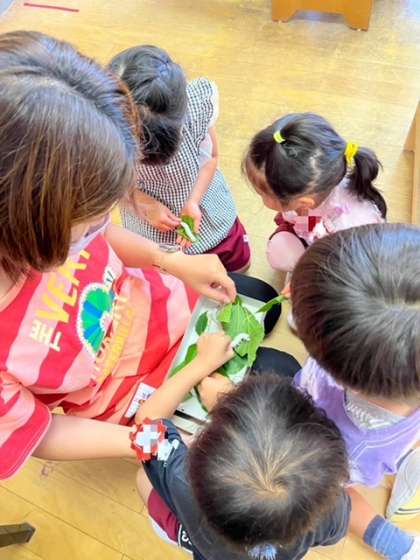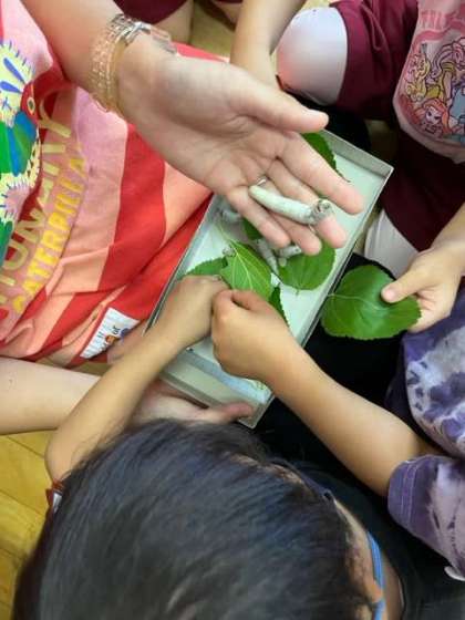 カイコをいただきました。幼稚園の園庭にある桑の葉を食べるんだって、たくさん食べるから取ってきてあげてねと教えてもらいました。白くてぷにぷにしています。