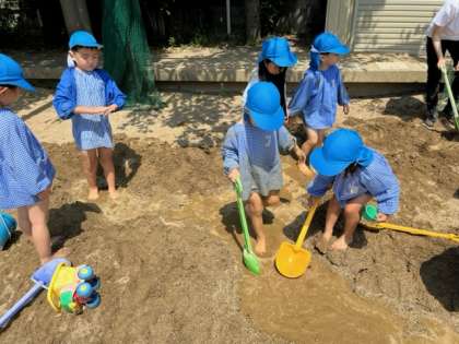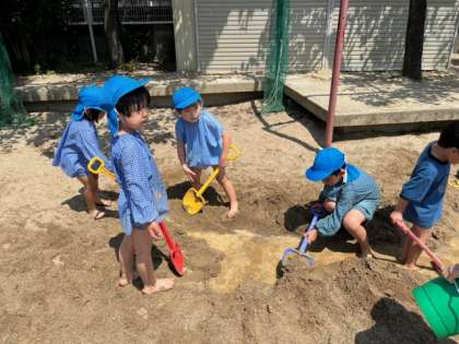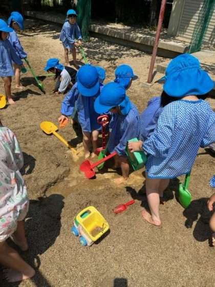 お昼からとても暑かったので、砂場に水を流して、道を作ったり、バケツで何度も水を運んだり、水の道を歩いたりしました。