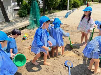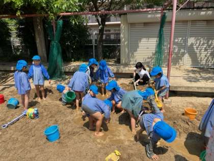 「気持ちいい」「冷たい」「楽しい!」と大喜びのあお組。足も手もどろんこになって、水に親しんで、十分に遊びました。