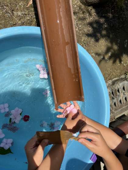 森の中の秘密基地から、島まで川を繋げようということになり、樋を使って川をつくり始めました。なかなかうまく流れず、坂道にするにはどうしたらいいか、水が漏れるから組み方を変えないと、とみんなで色々と試し、やっと川が繋がり、水が流れました。ついに流れた!と大喜びで、葉っぱやお花を流しました。今度はここに流れる船や、キラキラの宝物をつくりたい、とこれからのしたいことを話し合いました。