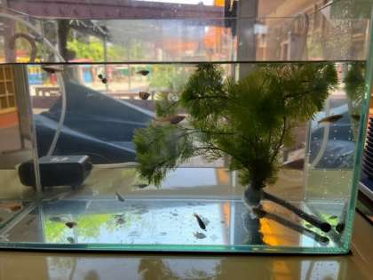幼稚園にメダカが仲間入りしました。お腹に卵を抱えているメダカもいます。気持ちよさそうに泳いでいます。