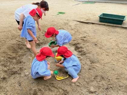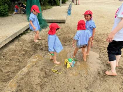 あか組も「どろんこしたい!」とお弁当を早く食べて、準備をして、砂場に飛びだしました。「きゃー、気持ちいい」「海みたい」と大喜び。「道ができたよ」「一緒に通ってみよう」と誘ってくれました。