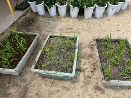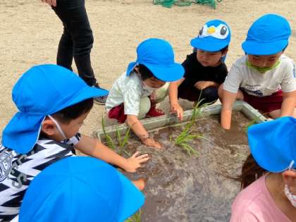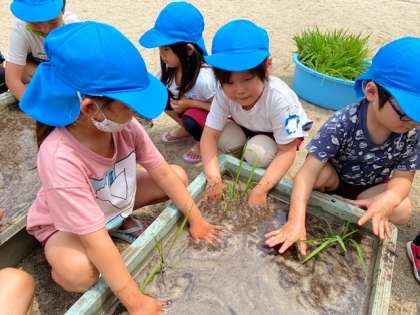 初めて稲の苗を見てびっくりしたり、「お米ができるんだって!」と楽しみにしていました。大きく育ってほしいですね。