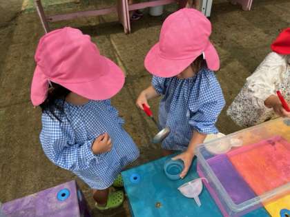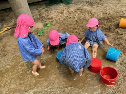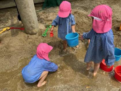 もも組の子どもたちも幼稚園生活に慣れ、水に触れることを楽しみ、活発に遊んでいます。友達と一緒に遊ぶ楽しさも感じているようです。