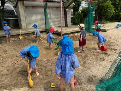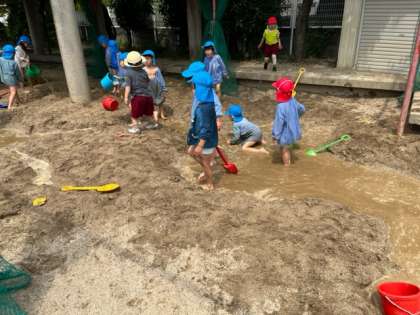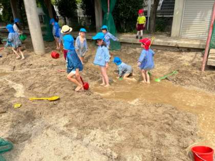 今日も道をつくって、水を流して遊びました。ジャブジャブと入っていくと「気持ちいい!」