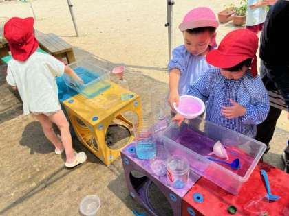 暑い日が続き、園庭では水にふれて遊ぶ子どもが多いです。色のついた水を触ったり、入れ替えたり、スーパーボールを集めたりして、楽しんでいます。