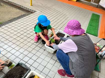 指をチョキにして、黒いポットのお尻を押してと教えてもらいながら、苗をどんどんと植えました。「上手にしてるね」と褒めていただき、「お花きれい」と一生懸命に植えていました。