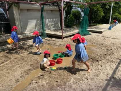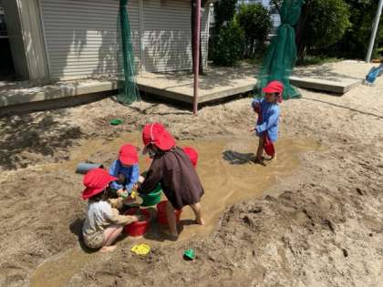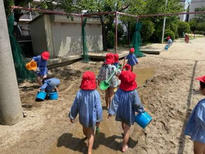 今日もとても暑く、水が気持ちいいです。道を掘り、ここまで届くかなと言いながら水を流して、自分も水と一緒に歩いていました。