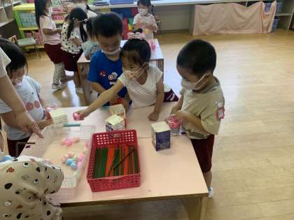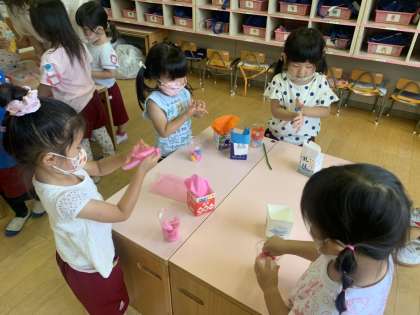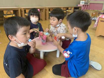 ままごとを楽しむ子どもたちは、自分だけのパフェをつくりました。「これはクリーム」「いちごのジュースになったよ」「おいしいやつできたよ!」といろいろ教えてくれました。さっそく自分のジュースを持ち寄り、みんな集まってパーティが始まりました。