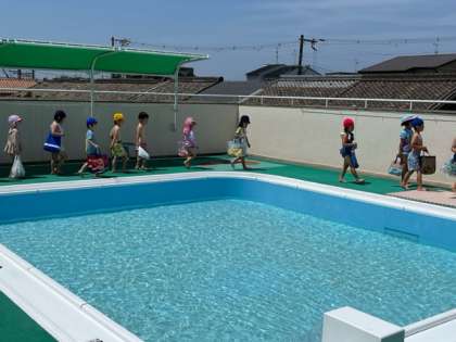 あか組も着替えて、プールを見にきました。たくさんの水に、来週からのプールを楽しみにしていました。