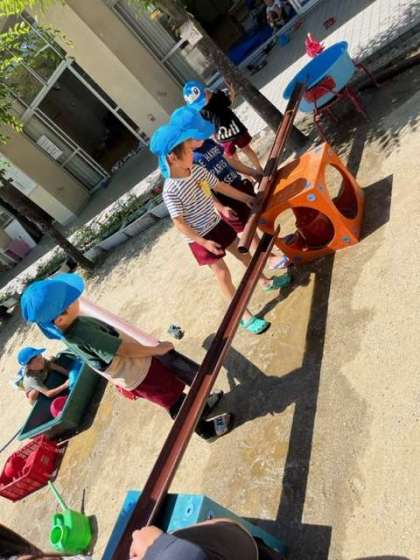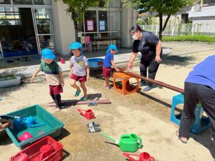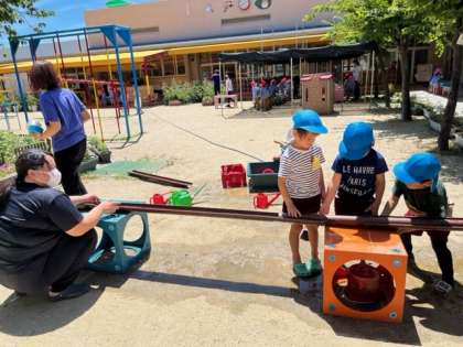 室内で遊んでいたわんぱくだんごっこですが、外にも広がり、とゆを使って水を流す方法を考えていました。なかなか流れていかず、苦戦していましたが、友達や先生と一緒に意見を出し合い、工夫していました。