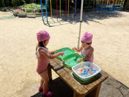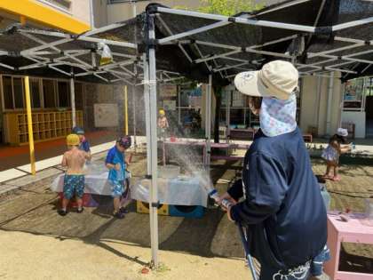 プール遊びはありませんでしたが、水着に着替えて、園庭で水遊びを楽しみました。体で存分に水を感じながら、遊んでいました。シャボン玉もふわふわ飛んでいました。