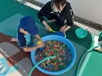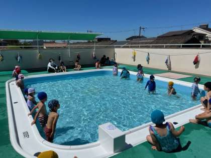 少しずつ水に慣れてきました。見学の子どももプールサイドで水にふれて遊びました。