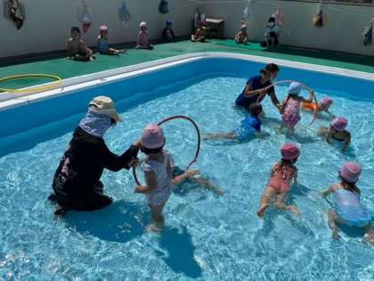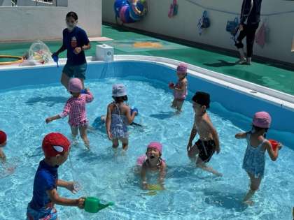 今日はワニさんになって歩いたり、トンネルをくぐってみたり、ジョウロで水をかけたりして遊びました。怖がる子どももほとんどなく、「気持ちいい」と喜んで入っています。