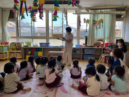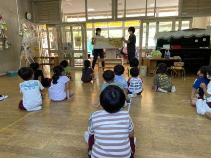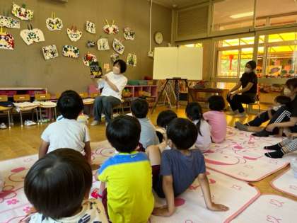住吉図書館のボランティアの方に幼稚園に来ていただき、絵本を読んでいただいたり、パネルシアターを見せていただいたり、大型絵本を読んでいただいたりして、お話の世界の中で楽しませていただきました。子どもたちは、お話の世界に引きこまれて、よく聞いていました。季節感も感じられて、素敵な時間を過ごさせていただきました。ボランティアの方に、長いお話もあったのに、みんなよく聞いてくれていて嬉しかったと褒めていただきました。