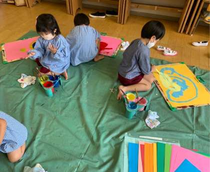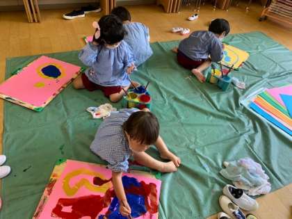 初めて筆で絵をかいたよ!(もも組) 公開日 2022/07/07 更新日 2022/07/07 園の様子 初めて、絵の具と筆を使って、絵をかきました。大きな紙に自分の思いを絵の具で表現していました。きれいな色の絵の具での表現を楽しんでいました。「ぐるぐる楽しい」や、「混ざって緑になった!」と、後から話をたくさん教えてくれました。 いいね(0)