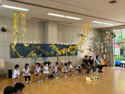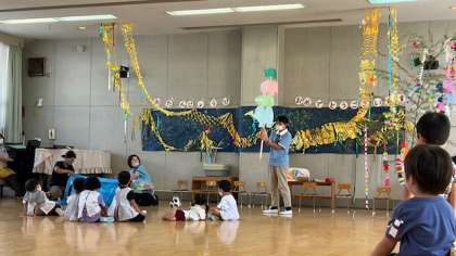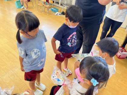 たくさんの友達や先生を誕生会でお祝いしました。あお組がプレゼントに風でよく回る風車を作りました。みんな誕生会を楽しみにしていて、自己紹介も頑張って言っていました。「ぞうくんのさんぽ」のペープサートも楽しみました。