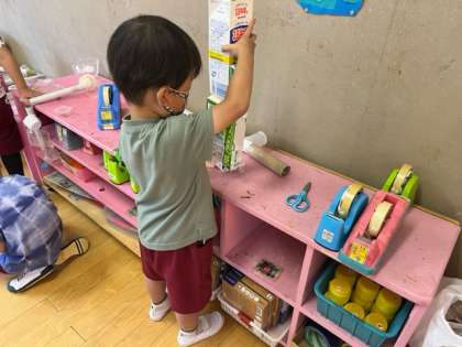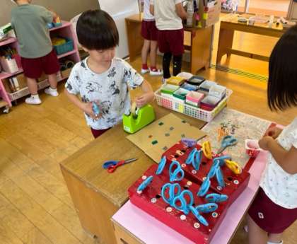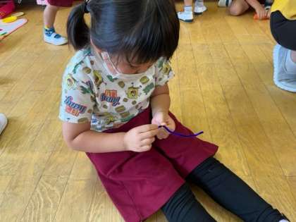 午後はゆったりと好きな遊びを楽しみました。お家から持ってきた素材やきれいな糸のモールをを使って、思いのこもった作品ができました。