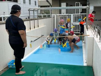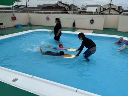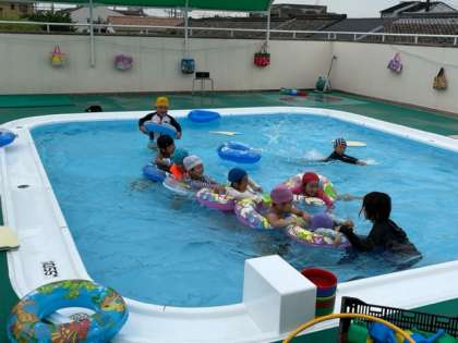 あお組のプール参観では、シャワーを浴びながら水鉄砲をしたり、浮き輪でみんなでつながって泳いだり、ビート板をもって先生と一緒に泳いだり、いろいろなことを楽しんでいます。存分にプール遊びを楽しんでいる様子を見てもらうことができました。