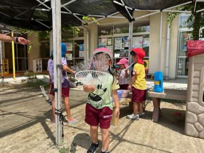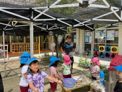 シャボン玉を楽しみました。毛糸をつなげたもので大きなシャボン玉を作ったり、鎖やうちわを使ってたくさんのシャボン玉を作ったりして、いろいろな作り方があることを楽しみました。