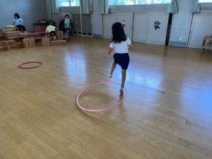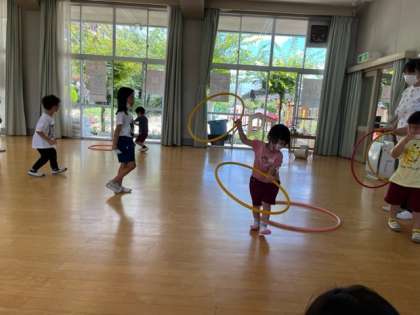 リズム室で、遊びました。大小のフープを使って、足で回したり、手でクルクルと回したりしていました。