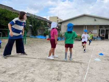 リレーを楽しんだあお組。「速いから1番最初に走って」「最後も速い人のほうがいいんじゃない」「順番はどうする?」と作戦を考えて、スタートしました。負けても、最後まで頑張って走り、「友達の応援が力になる!」と言う子もいました。