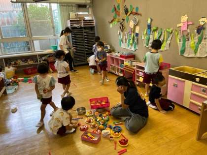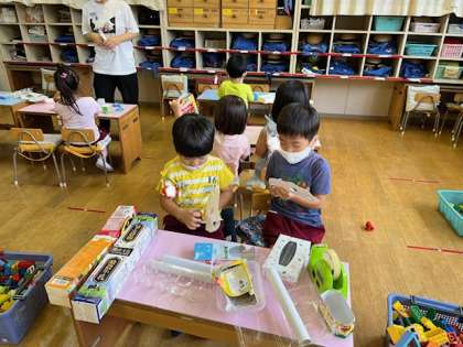 あか組の遊びの様子 公開日 2022/08/27 更新日 2022/08/27 園の様子 ごちそうをお皿に並べて友達に持って行ったり、作りたいものを素材を使って作ったり、久しぶりに幼稚園の遊具で、友達との遊びを楽しみました。 いいね(0)