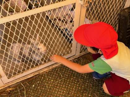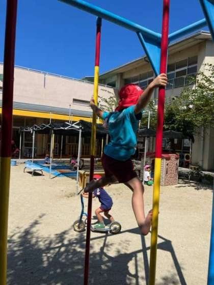 砂場では、さら砂を作るんだと、缶の蓋を使って、上手につくっていました。久しぶりに会ううさぎさんにもご飯をあげていました。「見て!見て!」と、2つの棒をつかって登り棒を登る様子も見せてくれました。