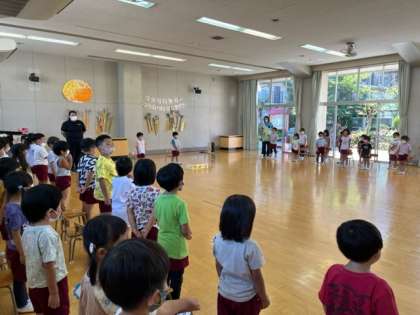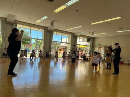 今日は9月生まれの友達の誕生日でした。あか組の友達ばかりでしたが、元気に走って入場しました。みんなにお祝いの歌を歌ってもらったり、お祝いの言葉を言ってもらって、嬉しそうでした。楽しみにしていたお家の人とのダンス「ふたりでできること!」も楽しみました。