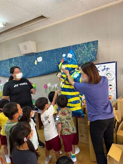 住吉大社さんの田んぼに置いていただく、かかしができてきました。あお組の子どもたちが考えたかかし「サンダーキングドラゴン」です。あお組の仲間なので、名札もついています。懐中時計を持っていたり、金色の羽根もついていたりして、強そうです。お米を狙ってくる鳥を追い払ってくれそうですね。