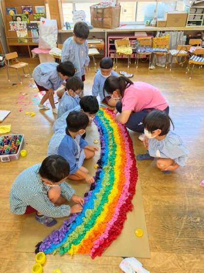 運動会のアーチの飾りをつくりました。コツコツと根気が必要でしたが、いつも歌っている、「にじのむこうに」を口ずさみながら一つずつお花紙を丸め、丁寧に貼っていました。