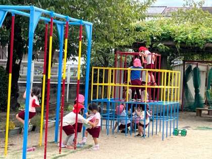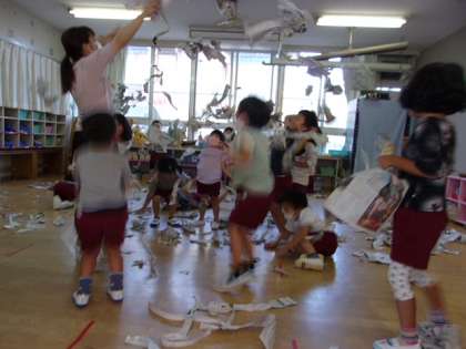 あか組は、新聞紙をビリビリちぎって、部屋にいっぱいにして遊びました。最後に新聞は違う遊べるものに変身しました。楽しみにしておいてください。もも組は、実習生の先生に絵本を読んでもらいました。その後、色探しゲームを楽しみました。探してみると、部屋の中にはいろいろな色がありました。その後、園庭で、もも組とあか組が一緒に遊びました。あか組さんがいろいろと教えてくれて、交流しながらの遊びは楽しいですね。