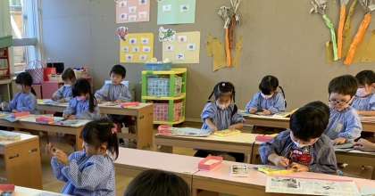 ハサミを使って、ダンゴムシを切りました。自分で好きな形に切っていき、それぞれ違う形のダンゴムシができあがりました。おしゃれな模様をかいて、「こんなダンゴムシになった!」と、自分がつくったものを嬉しそうに見せてくれました。 ?