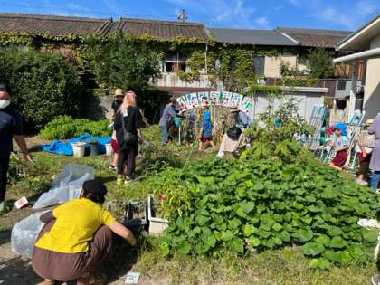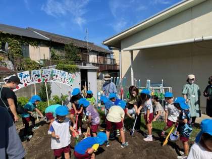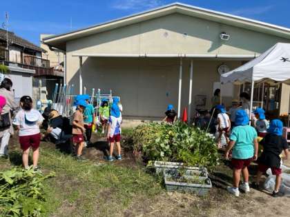 夏野菜を育てていた畑を整備しました。サツマイモだけを残して、他の苗を抜いたり、雑草を抜いたりみんなでして、とても綺麗になりました。大きなミミズが出てきて、ビックリしたり、草の量を比べたり、子どもたちも保護者の方も一緒に頑張りました。最後は土をほぐして、次は何を育てようかな、またいっぱいできたらいいのになと話していました。