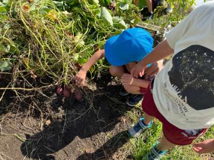 畑を整備して、サツマイモのつるの下をのぞくと大きなサツマイモが育っていました。「わあ、5個もついてる」と大喜びの子どもたち。「見て」と友達にも知らせていました。
