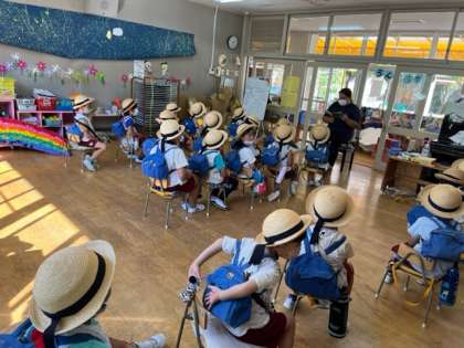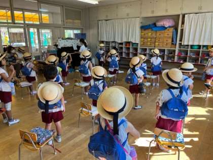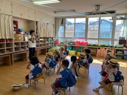 あお組は『エルマーのぼうけん』を一生懸命に聞いていました。長いお話を聞いて、想像をふくらませています。あか組は『うんどうかいのうた』を元気に歌を歌っていました。もも組は「あーがりめさーがりめ…」と変な顔や可愛い顔をして楽しんでいました。