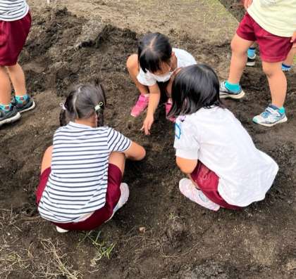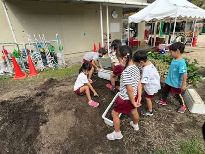 園庭に咲いていた花が枯れてきたり、ドライフラワーにできそうになってきたりしたので、プランターの片付けをしました。5歳児あお組がたくさんのプランターを運び、畑に戻してくれました。幼虫やミミズが出てきて、虫に夢中になる子どももいました。「虫に夢中になってないで、運んでよ」と言われて、運んでいる途中だったとあわててプランターを取りに行く姿もありました。あお組のおかげで、園庭が綺麗になりました。