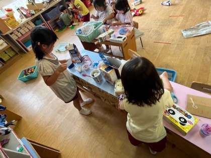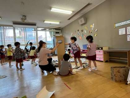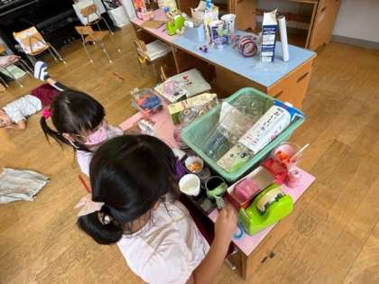 作るのが大好きなあか組。新聞紙や段ボール、素材を使って、様々なものを作っています。友達と一緒に、相談したり真似っこしたりしながら、作っています。先生に、自分からこんなふうにしたい!と伝えて一緒に考えたりしながら作っています。どんなものにでも変身させて、ごっこ遊びに発展していきます。あか組の発想力はすばらしいですね。