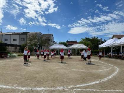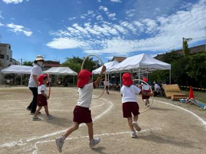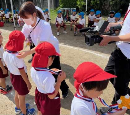 元気いっぱい、広い園庭を走り回って、忍者になって遊びました。自動車の術や木になる術から始まり、修行の中でいろいろな術を頑張りました。自分たちで頑張った!、楽しかった!と言っていた子どもたちは金メダルを首にかけてもらい、笑顔いっぱいでした。次はおうちの方に見てもらいましょうね。