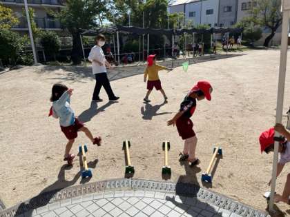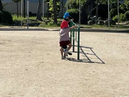 4歳児あか組が、5歳児あお組が運動会で見せていたチャレンジの遊びをしながら、「見て!見て!」と挑戦していました。「ちょっと難しい。できるかな?」と頑張っていました。憧れの気持ちが、運動会後すぐに挑戦する姿に表れていますね。