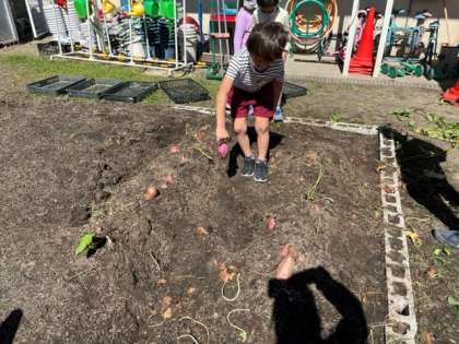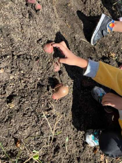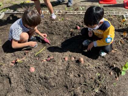 サツマイモのつるを畑から取ってみると、中からサツマイモが現れました。少し顔を覗かせていました。