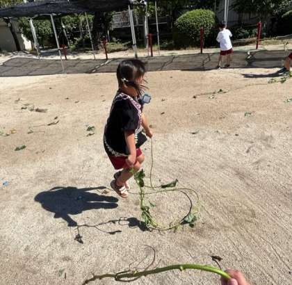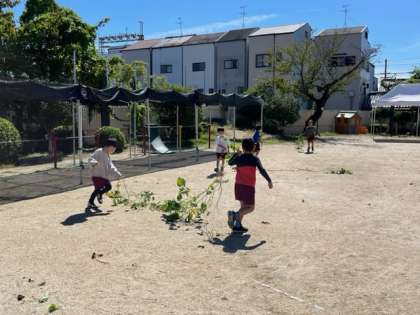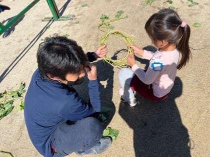 「めっちゃ長い!」と持って走ったり、縄跳びにして跳んでみたり、リースにしてみようと丸くしてみたりして、サツマイモのツルで思い切り遊びました。丸くなったツルを見て、「リレーのバトンみたい」と運動会ごっこをしたり、頭に乗せたりして遊んでいました。この後どうなるでしょうね。お楽しみに!