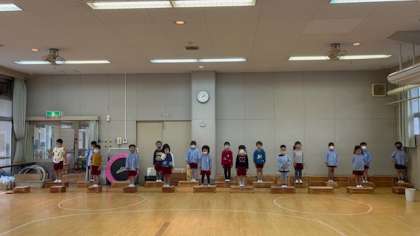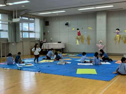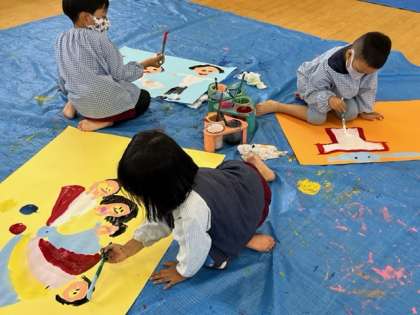 広いリズム室を使って、絵の具で絵をかきました。大きな紙に筆を使って、運動会で頑張ったことを表現していました。ていねいに時間をかけて、かいていました。帰る前には、みんなで並んで歌を歌いました。かっこよく立って、歌っていました。