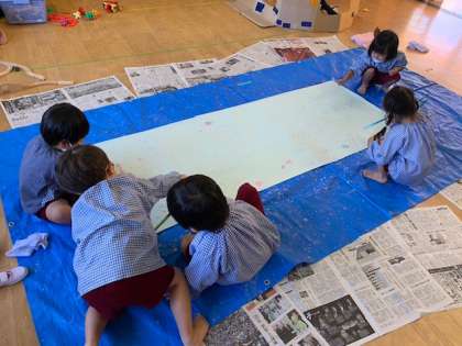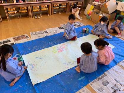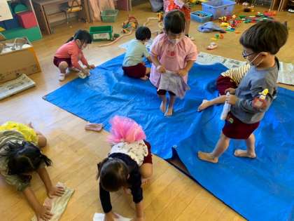 もも組では絵の具で遊びました。いつもは筆で絵をかくときに床や紙に垂れないように気を付けますが、今日はポトポト垂らすことを楽しみました。1学期に歌った雨だれぽったんを思い出し、歌いながら楽しみました。最後には、シートや床掃除を「一緒にする」と手伝ってくれる子どもたちもいて、「ピカピカやなぁ」と、嬉しそうでした。