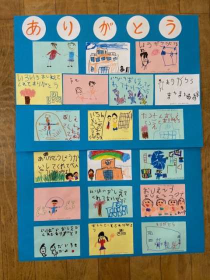 18日に住吉小学校との交流がありました。その時に、たくさんのことを教えてくれた、2年生のお兄さんやお姉さんにお手紙を書きました。「漢字の勉強もするって言ってたな」「給食早く食べたいな」と話をしながら、小学校へ行くことを楽しみにしている様子でお礼の絵をかいていました。