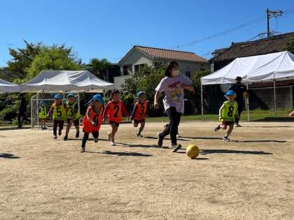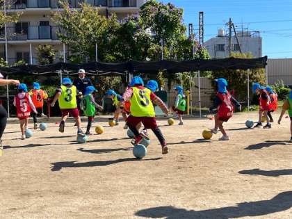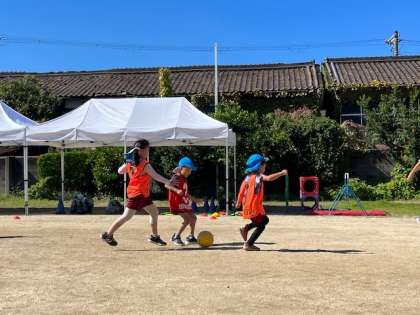 久しぶりのサッカー遊びでした。コーチの話を聞いて、言葉に合った動きをしたり、試合をしたりもしました。転んでもすぐ立ち上がり、ボールに向かっていました。あお組は、ボールを足で扱うことに少しずつ慣れてきました。