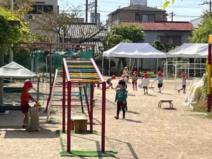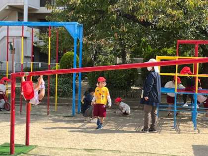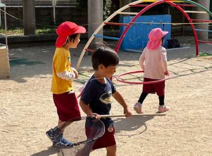 天気もよく、園庭で遊んでいたあか組、もも組。体を動かす遊びが大好きです。あか組がフープの修行をしていると、もも組の友達が「私も忍者する!」と言って、一緒に修行を楽しんでいました。