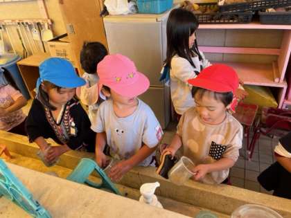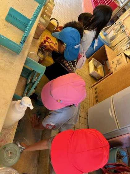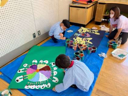 楽しかった思いやお話の絵をかいています。終わった後はみんなで、絵の具ポットや筆も洗います。