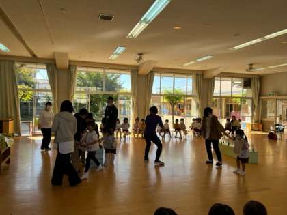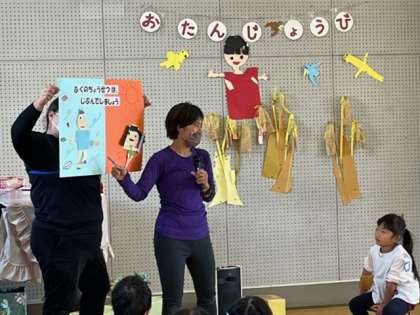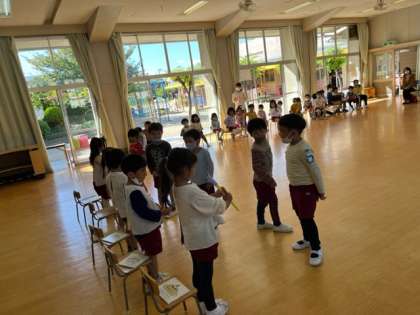 今日は10月の誕生会をしました。あお組からプレゼントのびっくり棒をもらったり、お家の人と一緒に先生の攻撃を乗り越えて宝物を取りに行ったり、みんなで忍者の体操をしたりしました。今月の安全目標は「服の調節」です。気温に合わせて服を調節して、健康に気をつけて、元気に過ごしましょう。